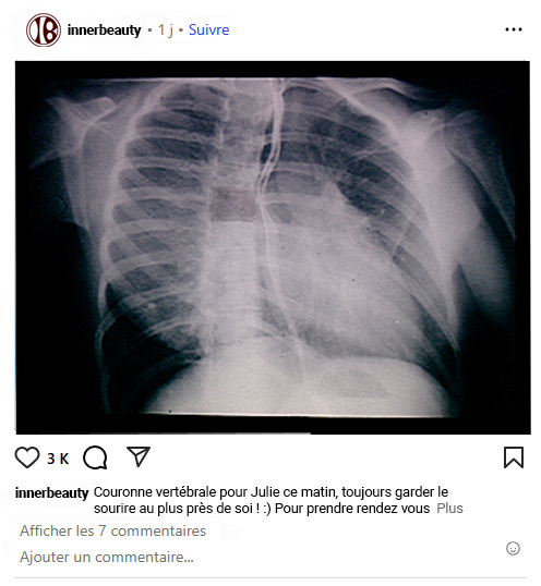 Suite à l'opération, vous serez logé dans le secteur chirurgie vertébrale de nos cliniques le temps de redevenir apte à vous lever par vous même (à savoir entre deux et trois mois) et disposerez d'une télévision, du repas et d'une garde-robe (des accessoires ainsi qu'un trépied peuvent être demandé mais sont à vos frais). Nous vous fournirons les films et photographies de votre bijou ainsi que radio de votre colonne vertébrale prises dès votre réveil, soit normalement quatre voire cinq heures après, pour vos futures publications. Nous vous mentionnerons sous le post concernant votre opération et nous attendrons une mention d'Inner Beauty© en retour sur les vôtres comme mentionné dans la charte pré-opératoire. Des médicaments anti-rejet vous seront prescrits, que vous devrez prendre systématiquement tous les jours ainsi qu'un corset que vous devrez gardé trois mois. Des effets secondaires seront à prévoir, comme des douleurs ou des paralysies éphémères. Nous nous assurerons que ces symptômes sont aussi esthétiques que possible. Nous nous assurerons aussi d'éviter le pire, ou de le rendre plaisant à regarder.